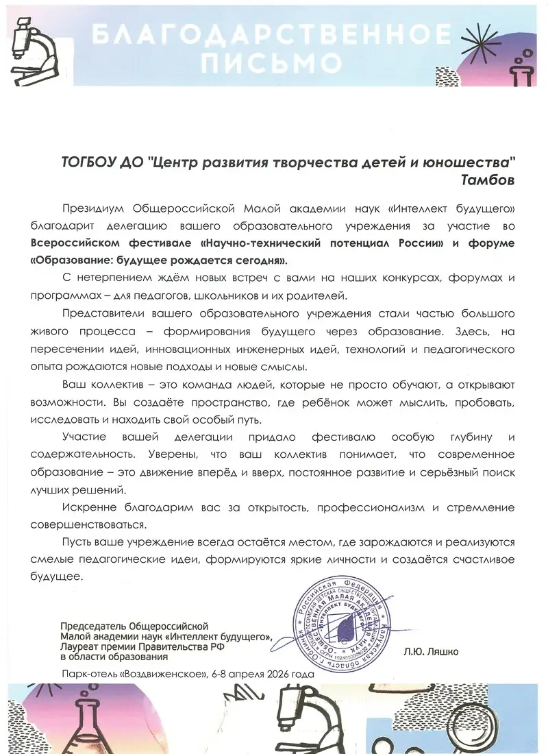 Благодарственные письма от Президиума Общероссийской Малой академии наук «Интеллект будущего» получили: