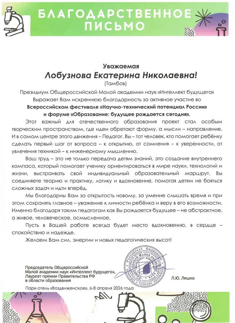 Лобузнова Екатерина Николаевна – за активное участие во Всероссийском фестивале «Научно-технический потенциал России» и форуме «Образование: будущее рождается сегодня».