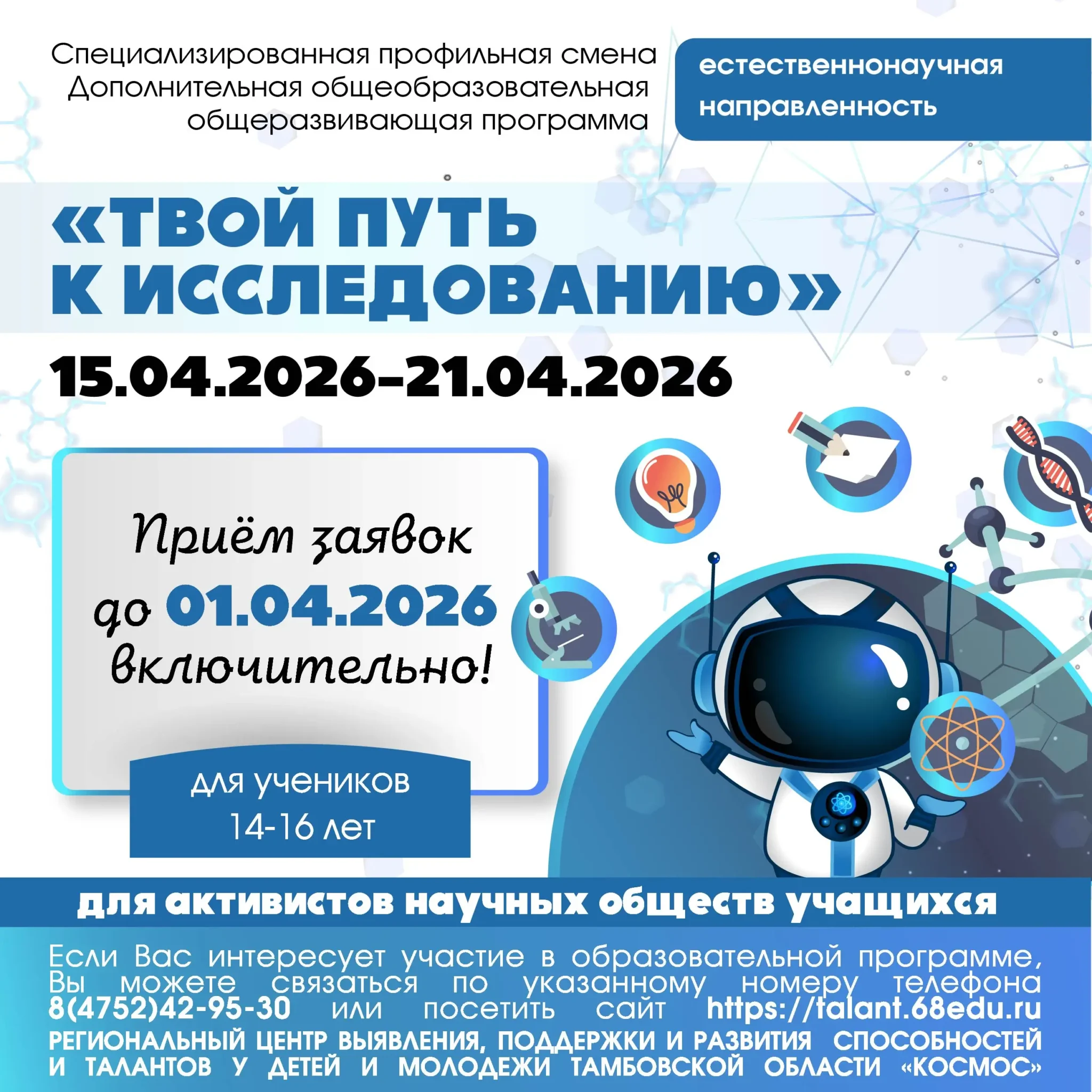 Регистрация участников интенсивной образовательной программы (профильной смены) «Твой путь к исследованию» до 01 апреля 2026 года по ссылке